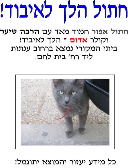 יום אחד גורי נעלם. פשוט כך. זה היה דבר חריג מאד ומשהו שלא קרה קודם. קראתי לו "גורי גורי גורי גורי" כמו תמיד, והוא לא בא. ואז השכן דיווח לי (באמת תודה שאתה מספר לי את זה שמונה שעות אחרי שזה קרה...) שגורי עלה והתיישב על טנדר גבוה, וכשהמכונית החלה לנסוע, גורי פחד לקפוץ, ונסע עמה אל הלא נודע. העובדה שהחתול שלי נמצא כעת איפהשהו בחיפה, חסר ישע, ללא אוכל והגנה גרמה לי לעצבות קשה. גישושים נוספים העלו שהמכונית ש"לקחה" את גורי, היא מכונית של איש שהגיע להסתפר אצל הספר שגר ממול לביתי. אז ביררתי את מספר הטלפון שלו, ובשיחת הטלפון האיש אמר לי שבאמת כשהוא יצא מהאוטו הוא ראה חתול קופץ מהאוטו לרחוב. הוא גר במרחק של כמה קילומטרים בשכונה אחרת. אז הכנתי מודעות ותליתי אותן בכל רחבי האזור.